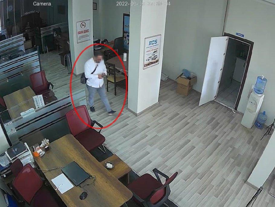 Gezer'in suç duyurusunda bulunduğu N.A.'nın, en son 30 Eylülde işe geldiği ve masasındaki not defteri ile telefonunda işlem yaptıktan sonra iş yerinden biriyle konuşup ardından çıktığı anlar ise güvenlik kamerasına yansıdı.