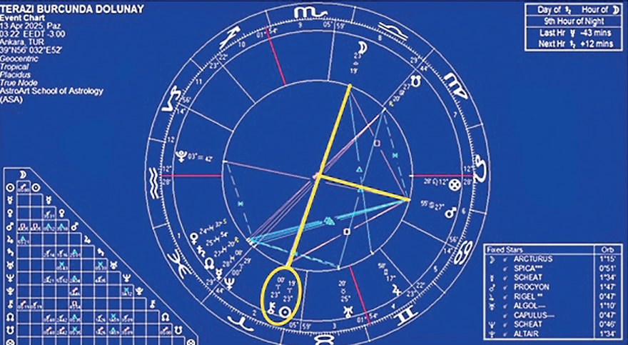 13 Nisan Pazar günü 03:22’de 23 derece Terazi burcunda bir dolunay meydana geliyor. Dolunayın ardından Ay’ın ilk açı yapacağı gezegen Mars olacağı için sert ve şiddetli olaylar, savaş atmosferi yaratan durumlar patlak verebilir. Aşağıda dolunayın Ankara merkez alınarak çizdirilmiş astroloji haritasını görmektesiniz.