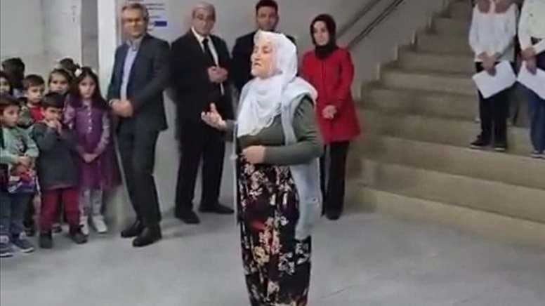 Beyaz tülbentli ve şalvarlı 70 yaşındaki Kıymet Diler de okulda okuyan torunu için programa katıldı.