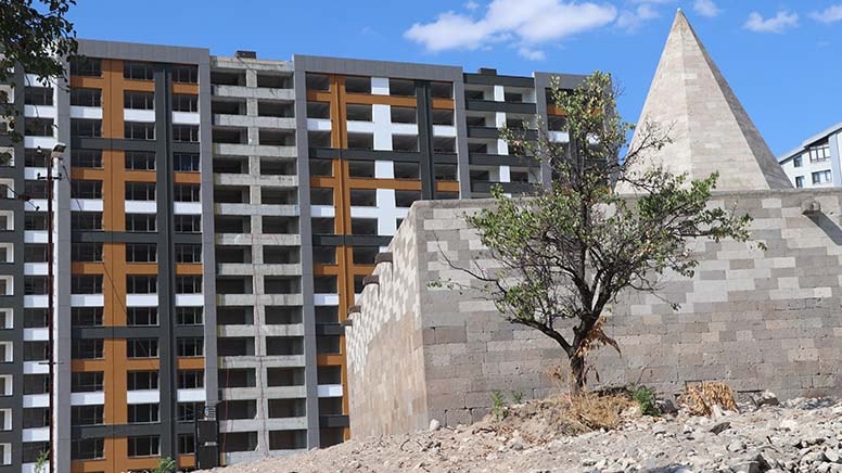 Çevre düzenlemeleri ve dış restorasyonu tamamlanan medresenin önüne 14 katlı bina inşa edildi.