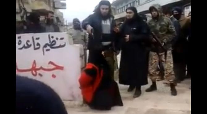 Görüntülere göre kasaba meydanına getirilen ve etrafı silahlı El Nusra militanlarında sarılı olduğu gözlenen başörtülü bir kadına önce diz çöktürülüyor.