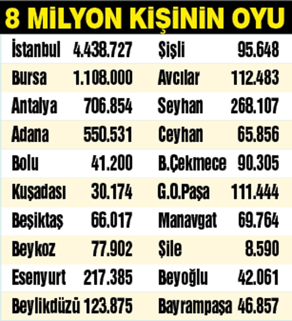 İktidar partisi AKP, 22 yıllık iktidarında ilk kez seçim yenilgisini tattı, elindeki birçok belediyeyi de CHP’ye kaptırdı. Türkiye genelinde CHP yüzde 37.8, AKP yüzde 35.5 oy aldı, MHP yüzde 5.7’de kaldı.