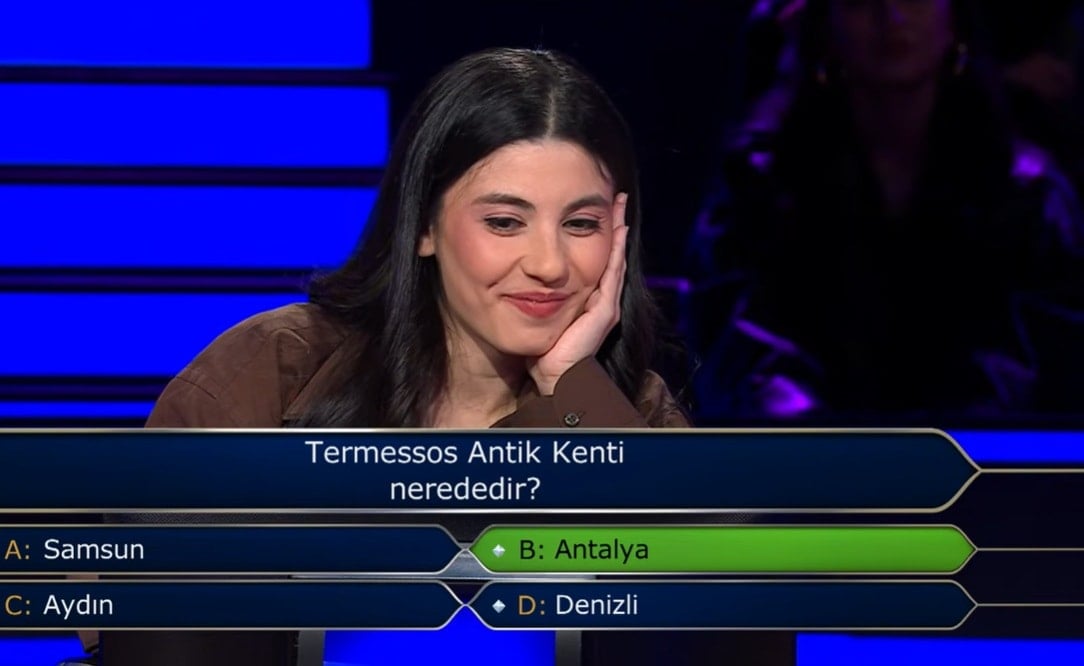 ATV'de yayınlanan Oktay Kaynarca'nın sunduğu Kim Milyoner Olmak İster yarışmasında genç yarışmacı Termessos sorusunda oldukça zorlandı. Ter döktüren soruda yarışmacı çekildi ve 200 bin TL ile ayrıldı.