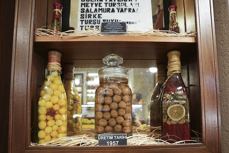 Özcan, raflarda sergilenen turşuların vatandaşların ilgisini çektiğini belirterek, "Dükkanımızda 1957'den kalma erik turşusu da var. Bunu dedemin babası Mehmet Özcan kurmuş. Sonra hiç el sürülmemiş ve hiç açılmamış. Açsak şu anda bozulur. O yüzden biz de hiç ellemiyoruz, o tarihten bir hatıra olarak kalıyor. Sadece içinde erik turşusu olduğu belli ancak tüketim olmaz" diye konuştu.