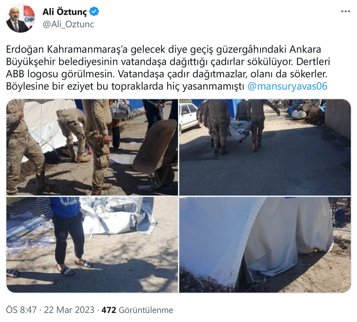 CHP Genel Başkan Yardımcısı ve Kahramanmaraş Milletvekili Ali Öztunç da konuyla ilgili Twitter hesabından yaptığı paylaşımda "Erdoğan Kahramanmaraş’a gelecek diye geçiş güzergâhındaki Ankara Büyükşehir Belediyesinin vatandaşa dağıttığı çadırlar sökülüyor. Dertleri ABB logosu görülmesin. Vatandaşa çadır dağıtmazlar, olanı da sökerler. Böylesine bir eziyet bu topraklarda hiç yaşanmamıştı" dedi.