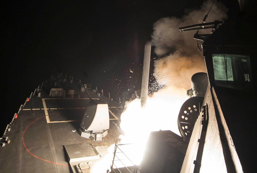 Füze saldırılarının Pentagon'da toplantı sürerken gerçekleştiği bildirildi. USS Ross ve USS Porter ABD füze destroyerlerinin Pentagon'daki görüşmeler sırasında Suriye açıklarına yaklaştığı ve füzelerle Humus yakınlarında El Şayrat hava üsssünü hedef aldığı duyuruldu. ABD cephesi harekatın ardından hava üssünün fotoğraflarını yayımladı.