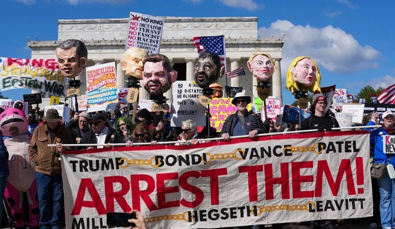 Göstericiler, Donald Trump ve Başkan Yardımcısı JD Vance’in dev kuklalarını taşıyarak Beyaz Saray’ın yetki sınırlarını aşmasına tepki gösterdi.