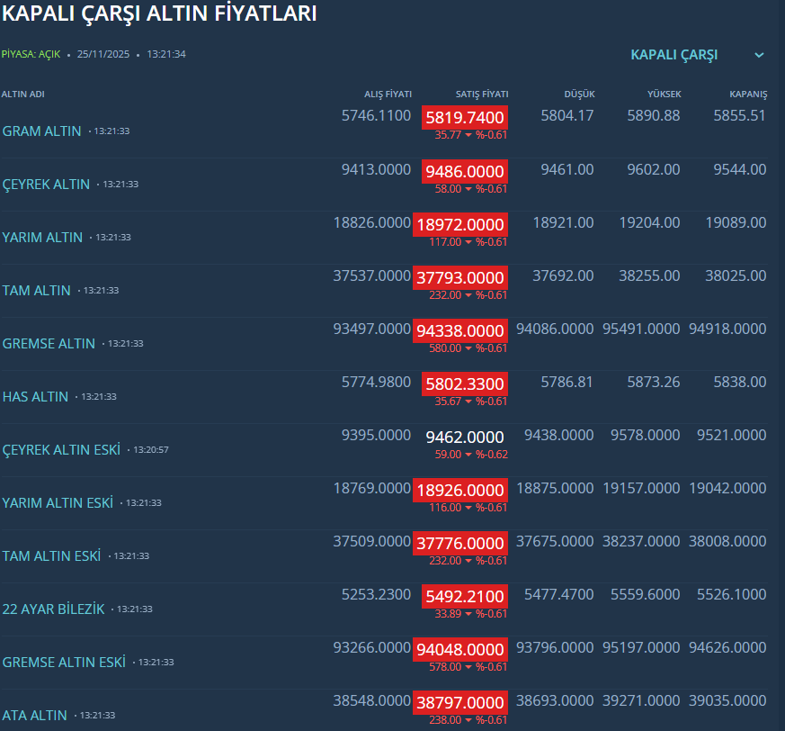 KAPALI ÇARŞI ALTIN FİYATLARI