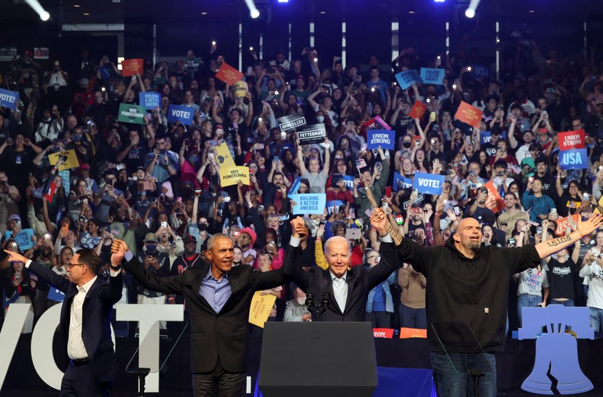 Obama ve Biden, Fetterman'a (en sağdaki kapüşonlu) destek vermek için mitinge katıldı.Obama, "Pennsylvania, siz bu seçimde gücü elde etmek için her şeyi söylemeye hazır olan ve her şeyi yapmaya hazır olan birisiyle, sizi gören, sizi bilen, size değer veren ve sizin değerlerinizi paylaşarak yaşamınızı daha iyi yapmak isteyen biri arasında seçim yapacaksınız" dedi.