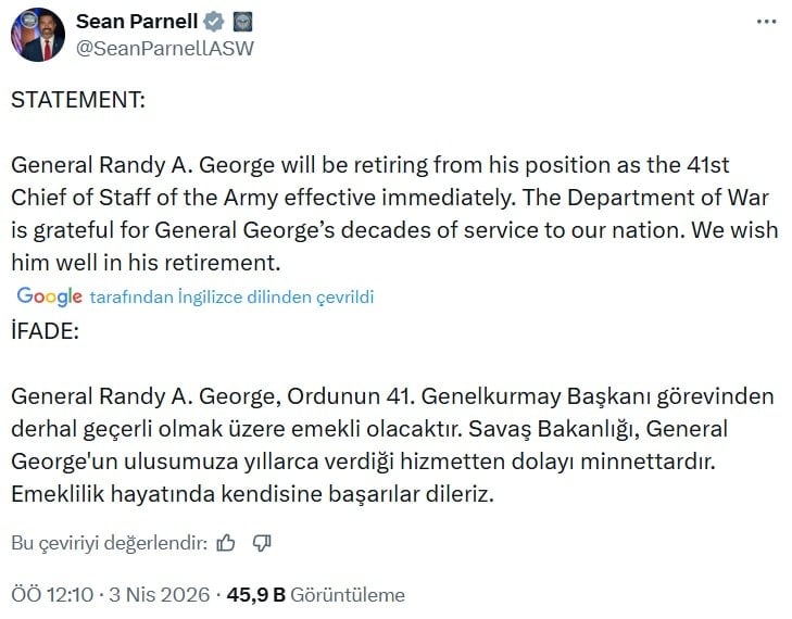 İddiaların ardından ABD Savunma Bakanlığı, Kara Kuvvetleri Komutanı Randy George'un "derhal emekli olacağını" duyurdu.