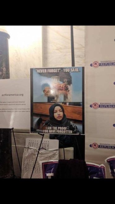 West Virginia'da Cumhuriyetçi Partinin bir etkinliğinde ortaya çıkan ve sosyal medyada yayılan afişte, Ilhan Omar ve arkasında 11 Eylül 2001'de New York'taki ikiz kulelere yapılan saldırı anının olduğu bir fotoğraf yer alıyor.