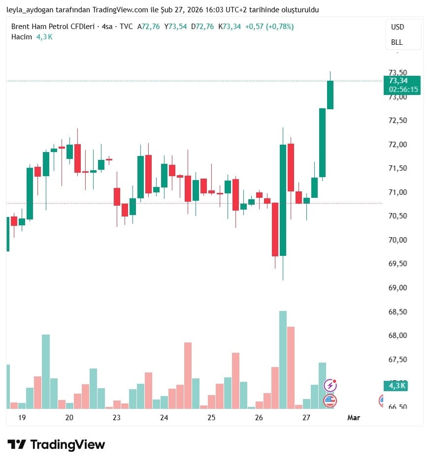 Brent Ham Petrol (UKOIL) yüzde 4,40 yükseldi. Petrol açıklamalardan önce 70,44 dolardı akşam seasında ise 73,54 dolarda bulunuyor.
