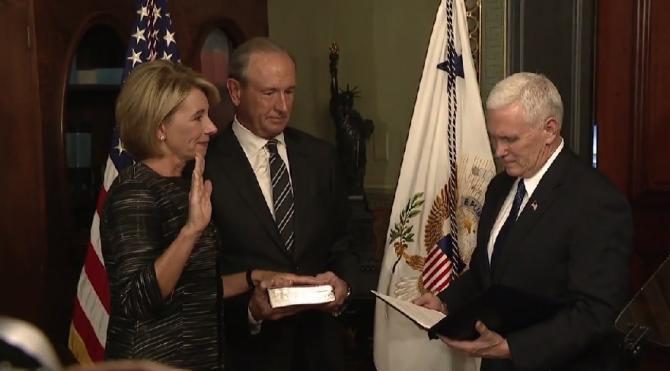 Hiç eğitim tecrübesi olmadığı eleştiri oklarına hedef olan milyarder DeVos, Başkan Yardımcısı Mike Pence'in önünde yemin ederen resmen göreve başladı.