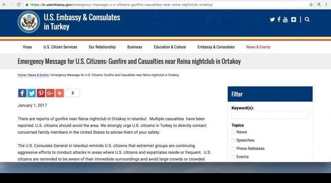 İSTANBUL Ortaköy'deki bir gece kulübünde yılbaşı kutlaması sırasında düzenlenen ve ilk bilgilere göre, 35 kişinin şehit olması, 40 kişinin de yaralanması ile sonuçlanan terör saldırının ardından ABD Dışişleri Bakanlığı, yeni yılın ilk gününde yazılı bir açıklama yaparak, Türkiye'de yaşayan Amerikan vatandaşlarını uyardı.