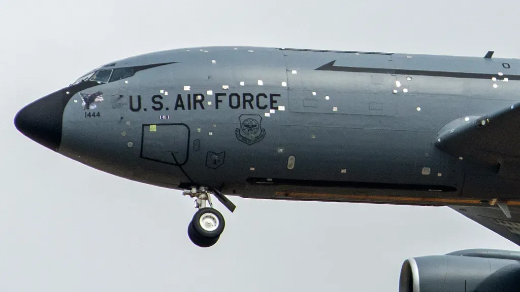 İran'daki operasyonlarda görev alan ABD'nin bir KC-135R tipi yakıt ikmal uçağı İngiltere'deki RAF Mildenhall üssünde gövdesindeki şarapnel hasarları üzerine yapıştırılan çok sayıda yamayla görüntülendi.