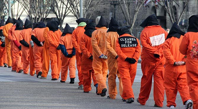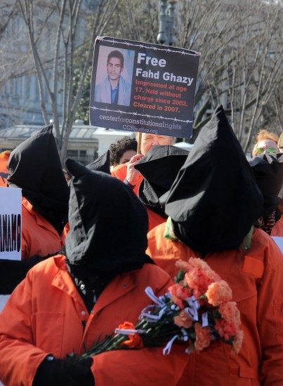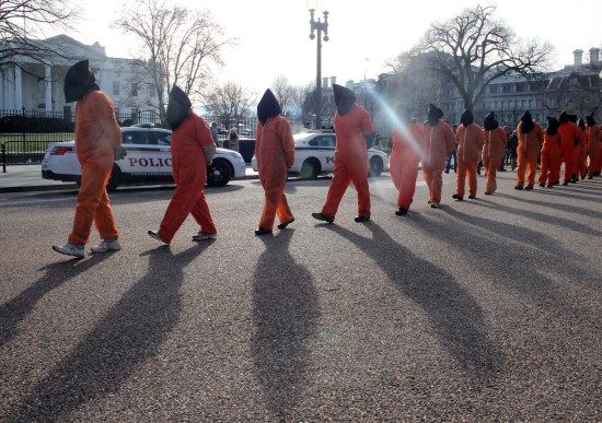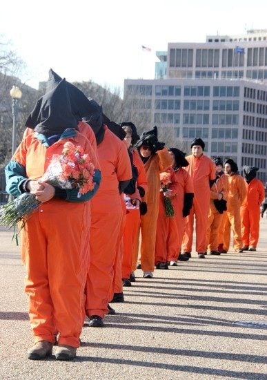 Protestocuların bazıları, Guantanamo'daki tutukların giydiği turuncu renkli üniformalarını giyip, siyah kukuleta taktı. Mahkumları sembolize ederek birbiri ardına sıralanarak zincir oluşturan protestocular, Beyaz Saray'ın önünde bir süre yürüdü.