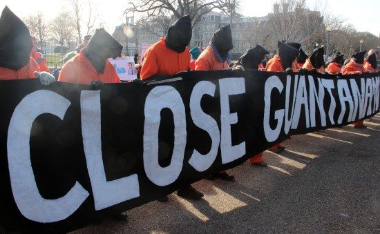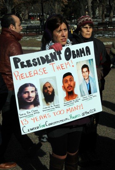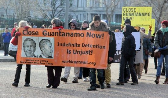 "Guantanamo'yu hemen kapatın", "İşkenceye hayır, gizli hapishanelere hayır", "İşkence her zaman yanlıştır" yazılı dövizler taşıyan protestocular, "Obama sözünü tut, Guantanamo'yu kapat" sloganı attı.
