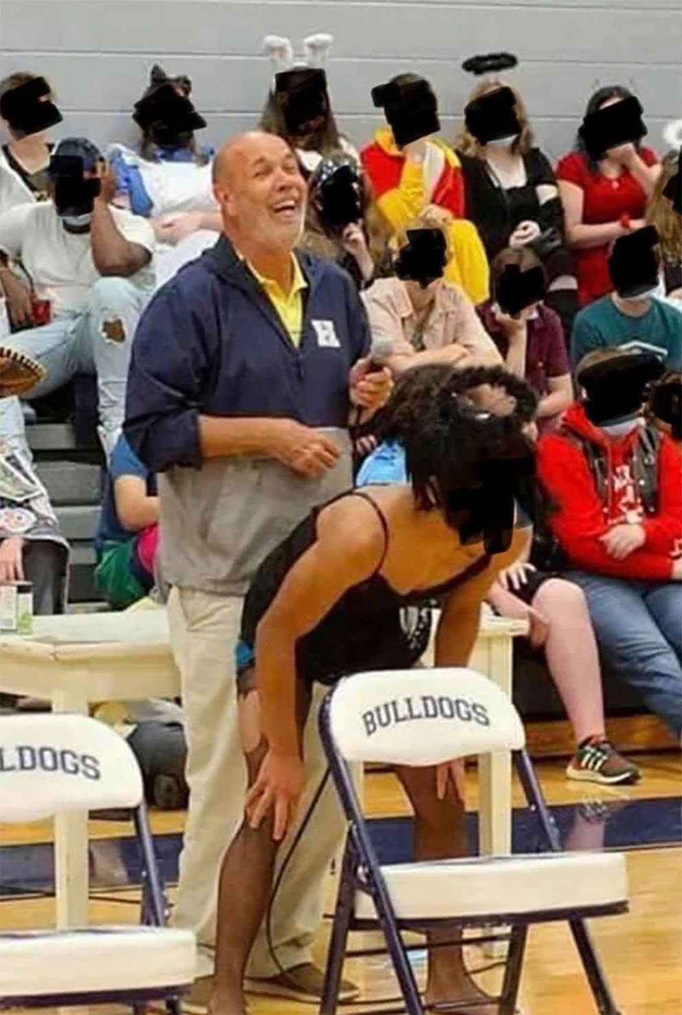 Söz konusu fotoğraflarda Hooters garsonları gibi giyinen genç kızlar 'twerk' yaparken, elbise giyen erkek öğrenciler ise okul müdürü Donald Mobelini ve yönetimindeki kişilere kucak dansı yaparken görülüyor.