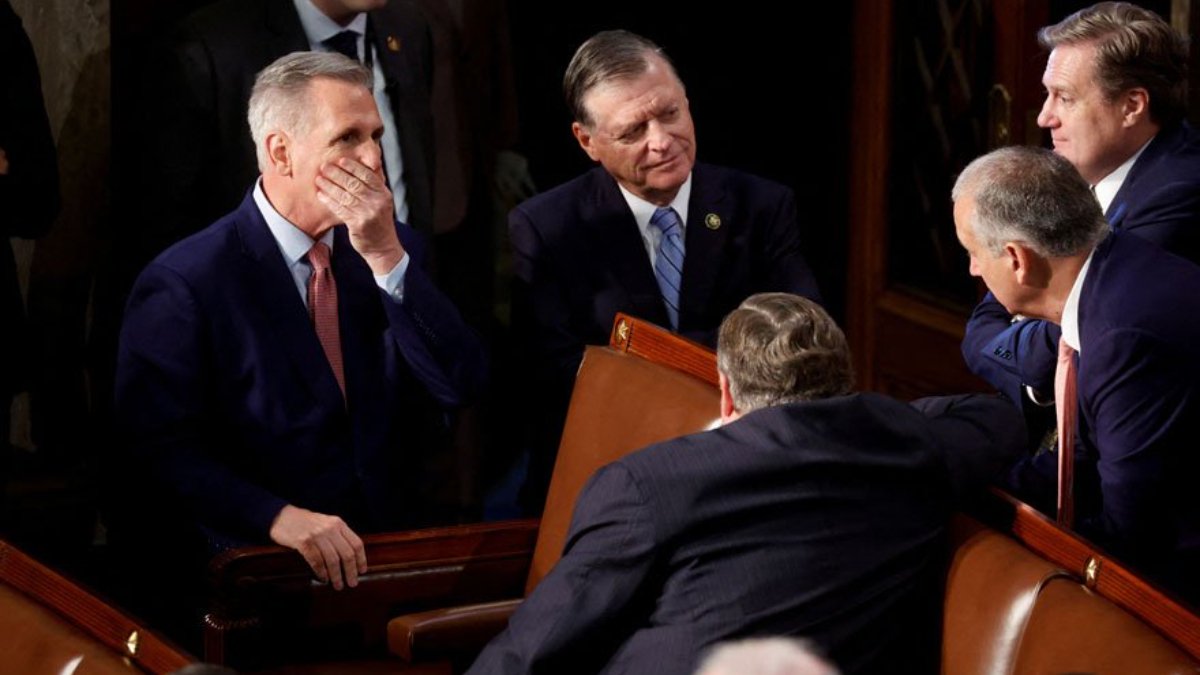 Kevin McCarthy'nin (ortada oturan) seçilememesi ülkede kriz yarattı.Cumhuriyetçilerin çoğunluk lideri Kevin McCarthy bu kez partisinden 202 kişinin oyunu aldı. Muhafazakar Cumhuriyetçilerin 20'si ise Jim Jordan'a oy vererek McCarthy'nin çoğunluğu elde etmesine izin vermedi.