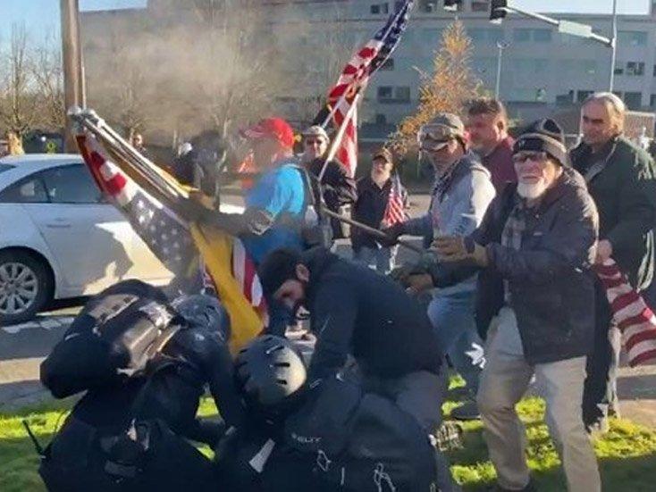 Trump destekçileri, ellerindeki bayraklar ile Antifa destekçilerine saldırdı. Çıkan olaylarda taraflar biber gazı kullanırken, tekme ve yumruklar havada uçuştu. Polis, havaya ateş eden biri kişiyi ise gözaltına aldı.