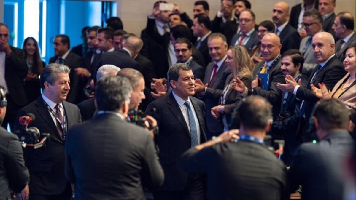 Ayakta alkışlanan Abdi’nin lacivert ceket ve mavi kravat tercih etmesi dikkat çekti. Abdi, Barzani ve eski HDP Milletvekili Osman Baydemir’le yan yana oturarak objektiflere poz verdi. Konferansta ayrıca eski başbakan ve Gelecek Partisi Genel Başkanı Ahmet Davutoğlu da yer aldı.