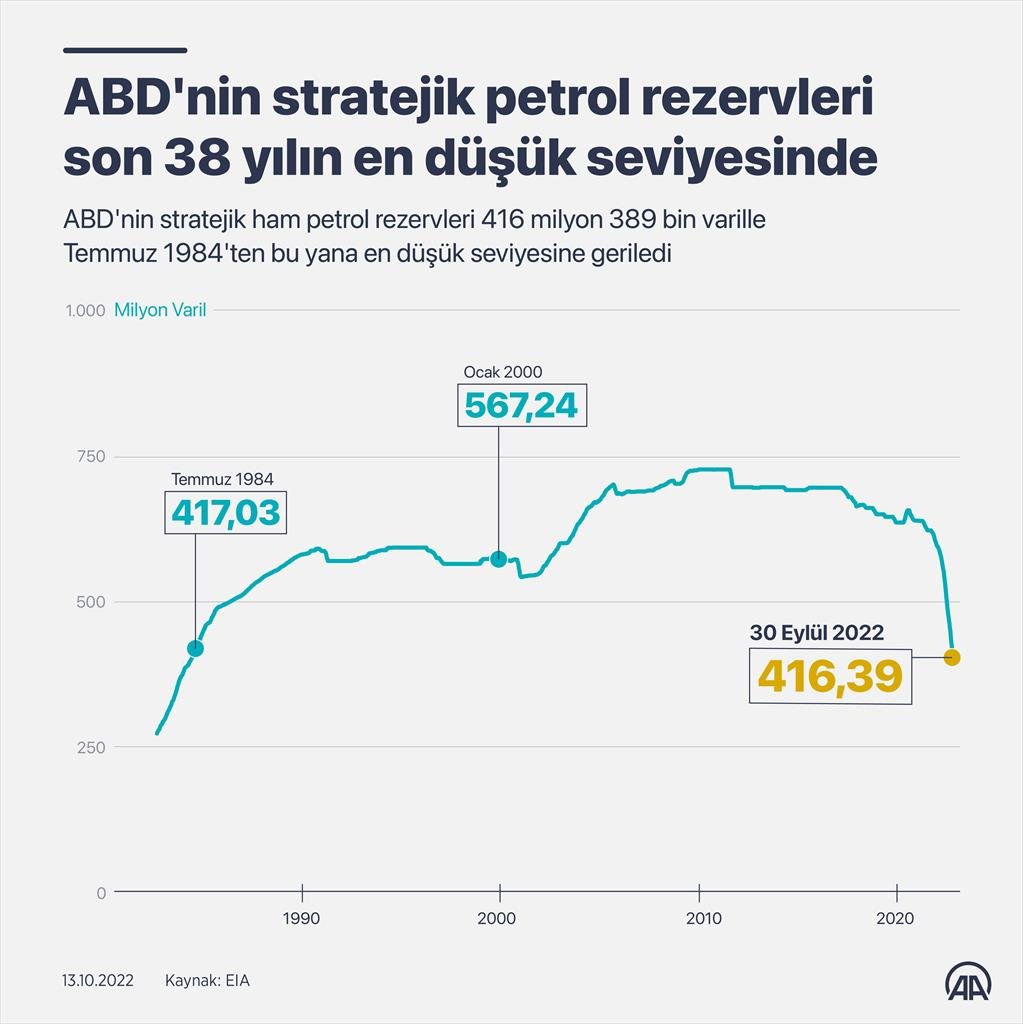 AA muhabirinin ABD Enerji Enformasyon İdaresinin (EIA) haftalık verilerinden derlediği bilgilere göre, ABD Enerji Bakanlığı tarafından stoklanan rezervler, eylül ayının son haftasında 416 milyon 389 bin varil seviyesinde kaldı.