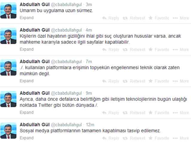 Cumhurbaşkanı Abdullah Gül, Twitter'ın kapanması ile ilgili olarak Twitter'da mesaj yayınladı.Başbakan Erdoğan'ın aksine Twitter'ın yasaklanamayacağını savunan Gül, "Sosyal medya platformlarının tamamen kapatılması tasvip edilemez. Umarım bu uygulama uzun sürmez" dedi.