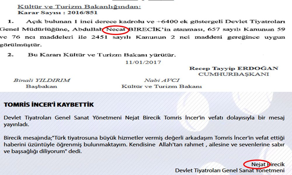 Birecik'in isminin ikinci isminin Resmi Gazete'de 'Necat' olaraka geçmesi de dikkat çekti. Abdullah Nejat Birecik'in ikinci ismi müdürlük görevini yürüttüğü Devlet Tiyatrolarının resmi sayfası başta olmak üzere birçok yerde 'Nejat' olarak geçiyor. Bakanlar Kurulu ve Cumhurbaşkanı'nın imzasının bulunduğu resmi evraktaki bu 'hatanın' ilerleyen günlerde nasıl bir 'hukuki sıkıntı' çıkaracağı ise şimdilik merak konusu.