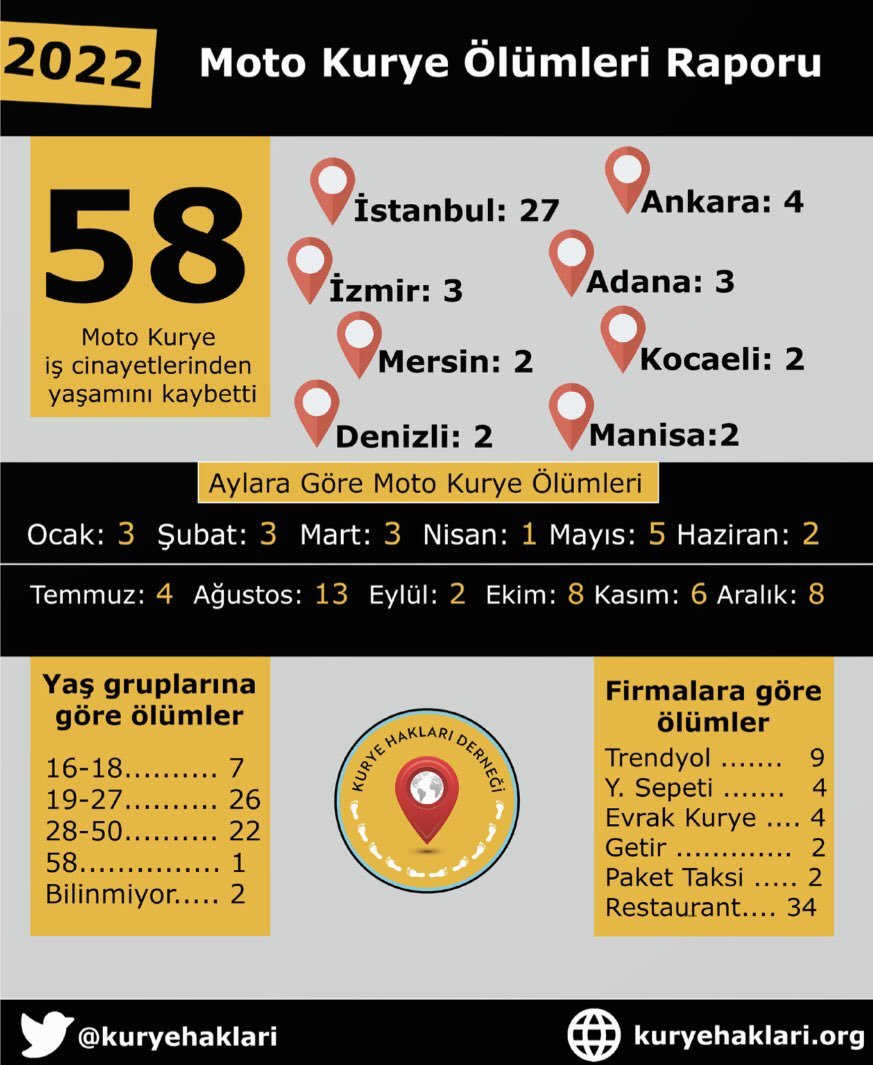 Türkiye’de en az 18 ilde moto kuryelerin hayatını kaybettiği belirtilen raporda, hayatını kaybeden 58 kuryeden 28’inin İstanbul’da çalışırken hayatını kaybettiği açıklandı. Raporda, İstanbul’da hayatını kaybeden kuryelerin çoğunlukla Pendik ve Küçükçekmece ilçelerinde hayatını kaybettiği ortaya çıktı. Araştırmaya katılan moto kuryelerin yüzde21,5’inin sosyal güvencesi olmadan çalıştığı, bu oranın Suriyeli erkek moto kuryelerde yüzde 68,4’e kadar çıktığı belirtildi.