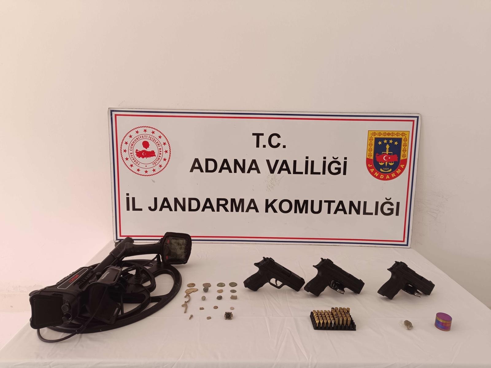 Ayrıca, dedektör, 3 ruhsatsız tabanca, bu silahlara ait mermiler ve 2 gram esrar da bulundu. Eserler, güvenlik güçleri tarafından muhafaza altına alınırken, şüpheli gözaltına alındı. Operasyonla ilgili soruşturma devam ediyor.
