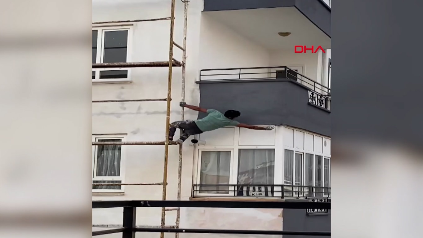 Adana'nın Kozan ilçesinde bir binada tadilat için kurulan iskeleden hiçbir güvenlik önlemi almadan sarkarak boya yapan işçiler, görenleri korkuttu.