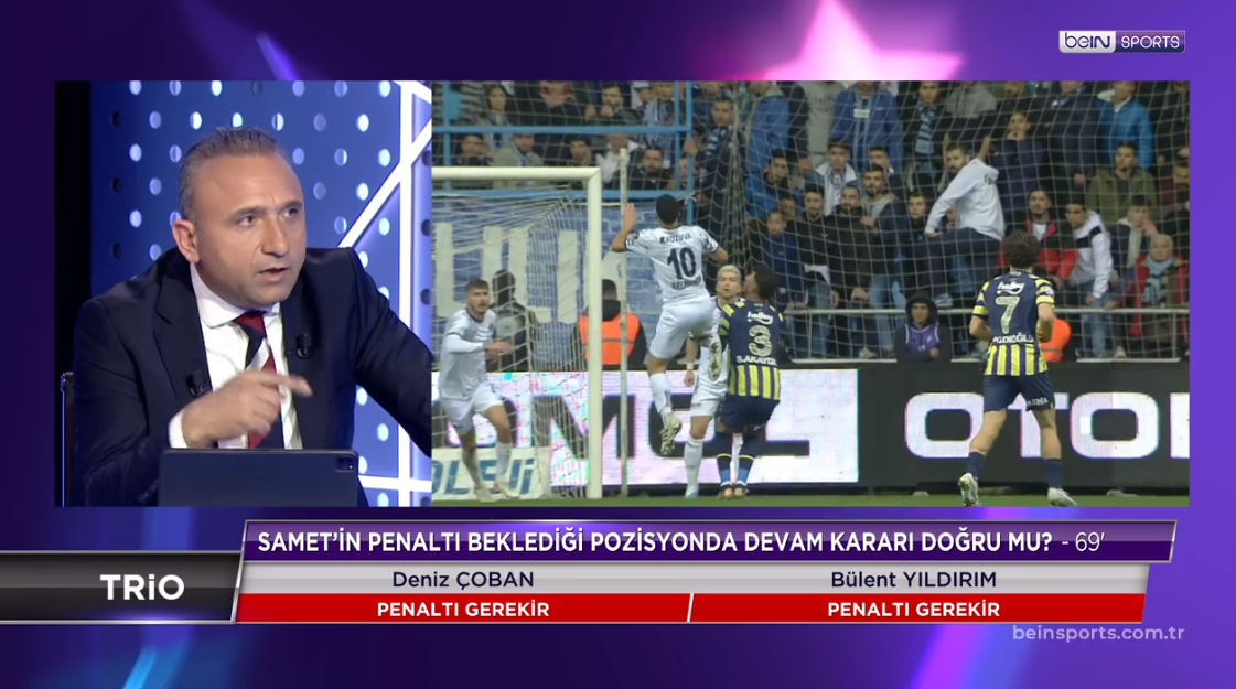 Fenerbahçe'nin penaltı beklediği pozisyonlar ve son saniyede Miha Zajc'a yapılan faulü değerlendiren eski hakemler, Adana Demirspor'a verilen iki penaltının da doğru karar olduğunu ifade etti. Öte yandan, Fenerbahçe kalecisi Altay Bayındır'ın bir pozisyonda topu ceza sahası dışında tuttuğu iddialarını da yorumlayan Deniz Çoban ve Bülent Yıldırım, tartışmalı pozisyonları detaylı şekilde yorumladı.