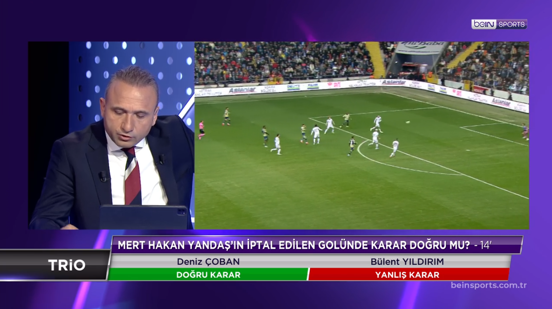 Bülent Yıldırım: Hissiyatım ele temasın olduğu yönünde. Yalnız VAR hakemliği yapmış biri olarak, burada sorun şu. Ben bunu ispat edebiliyor muyum? Elimde böyle bir açı var mı?Elle oynama tespitini arıyorum. Sahadan gelen birisi olarak, burada ele temasın mümkün olmuş olabileceğini ifade edeyim. Ancak bütün açıları değerlendirdiğim zaman ortada somut bir kanıt var mı? Orada soru işareti var. Burada elle oynamanın söz konusu olduğunu düşünüyorum. Eğer VAR odasında bu tespit varsa, kamuoyuyla paylaşsınlar. Elimizde sahip olduğum tüm açıları taradığımda ele temas olduğunu kanıtlayacak açı göremiyorum. Eğer kanıt yok ise, VAR sürece dahil olmamalı.