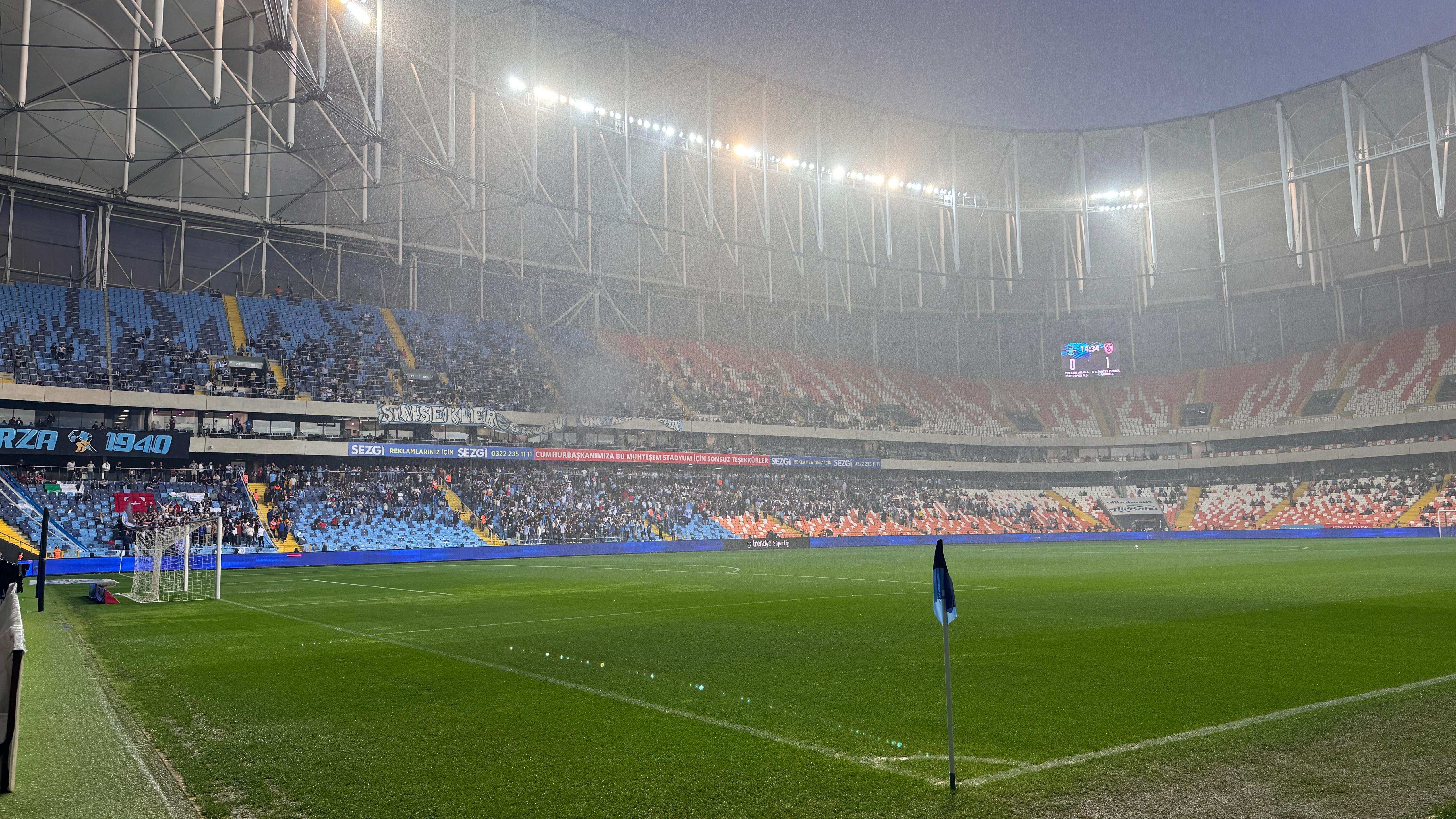 Trendyol Süper Lig'in 36. haftasında Yukatel Adana Demirspor ile Gaziantep FK arasındaki maçın ilk yarısında aşırı yağış nedeniyle 8 dakika ara verildi.