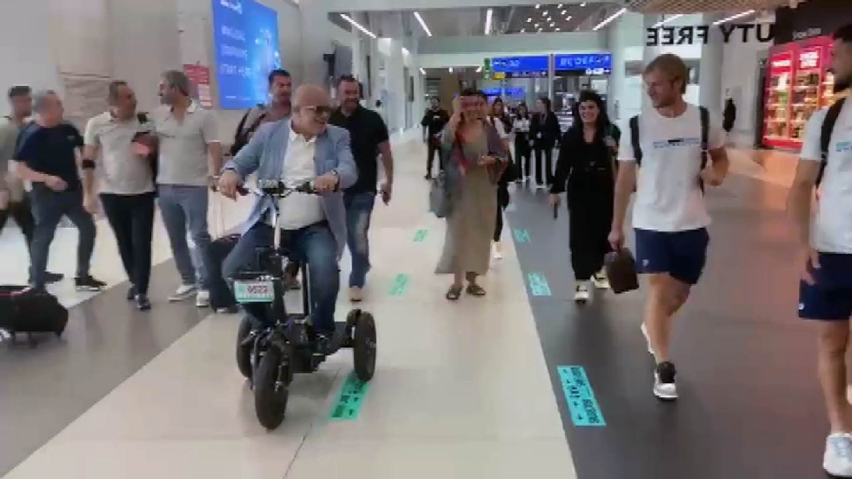 İstanbul Havalimanı'ndan kalkan uçakla Romanya'ya giden Adana Demirspor'da kafile ile birlikte yer alan Başkan Murat Sancak'ın havaalanı içinde elektrikli bisiklet kullanması keyifli anlara sahne oldu.