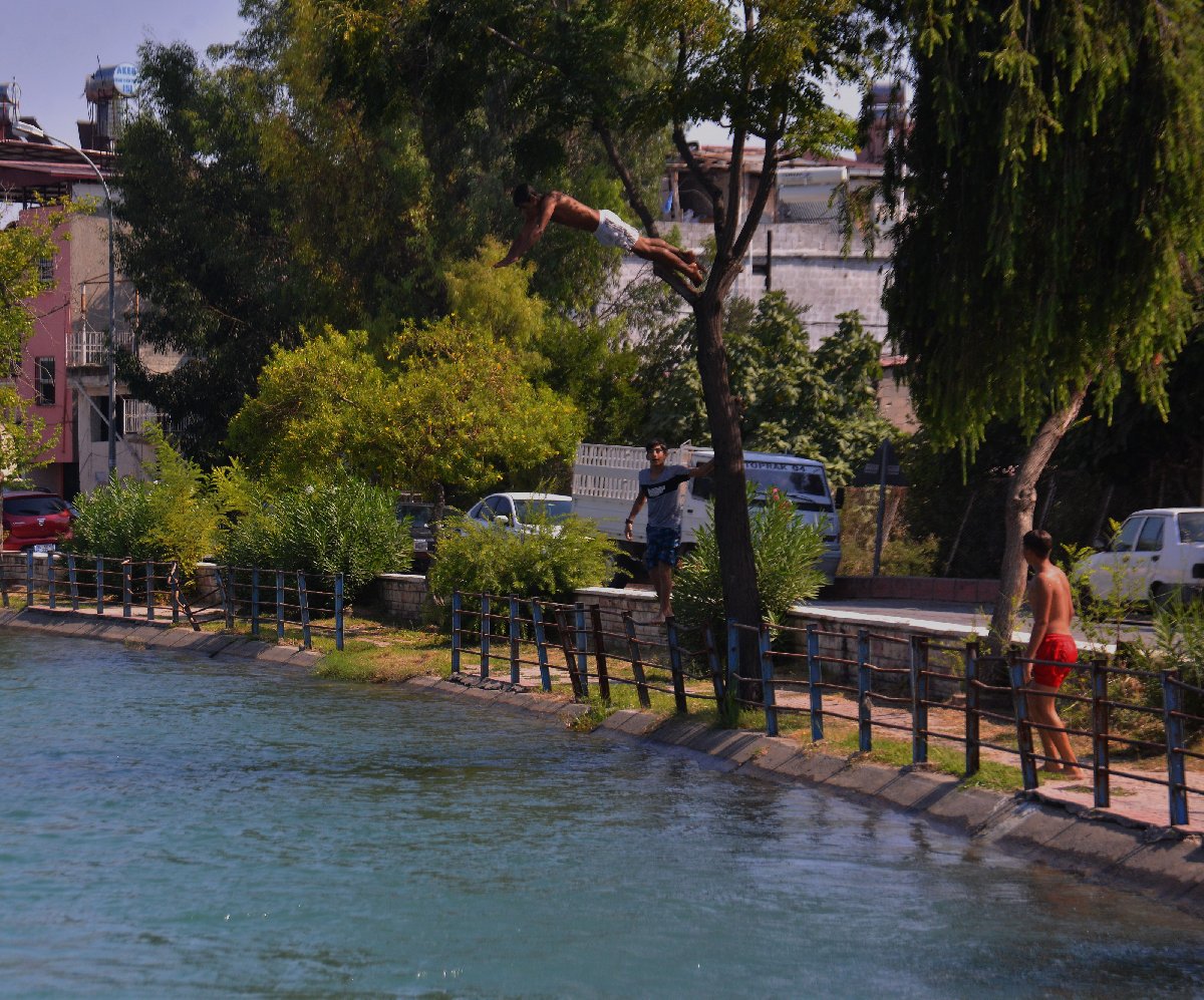 Yüreğir ilçesindeki sulama kanalına arkadaş grubuyla gelerek yüzen Abdullah Miraç (15), “Hava sıcak olduğu için sulama kanalında yüzüyoruz. Ağaçtan atlayınca eğlenceli oluyor” dedi.