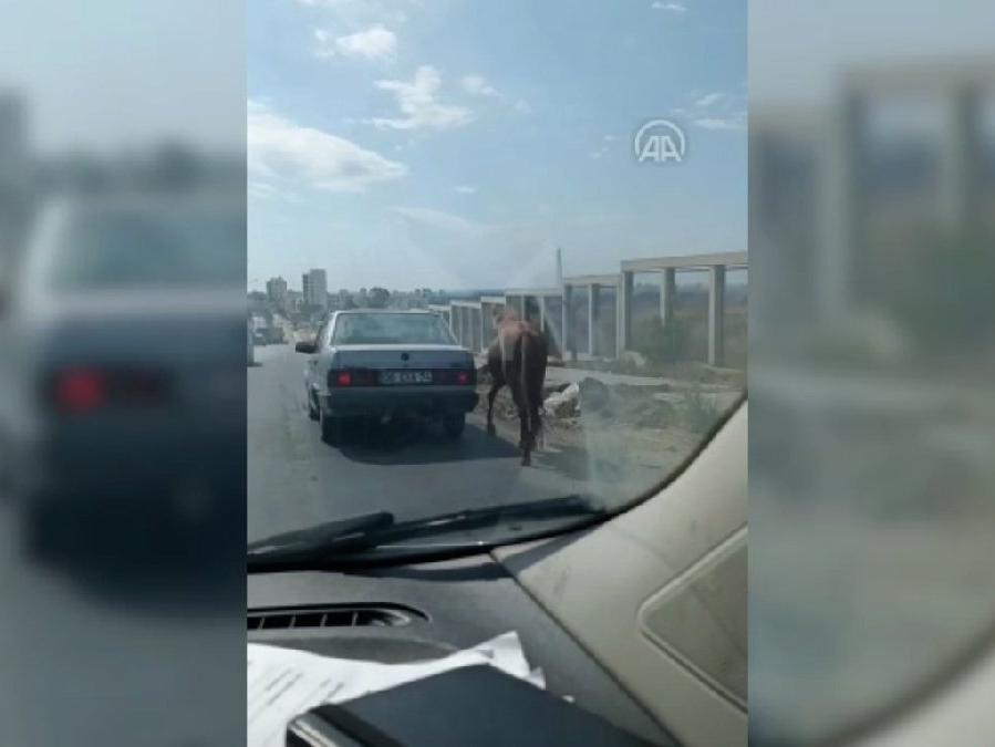 Çatalan Caddesi'nde bir atın 06 EVA 74 plakalı otomobilin arkasına iple bağlı halde koşturulduğunu gören başka bir araçtaki yolcu olayı cep telefonu kamerasıyla kayda aldı.