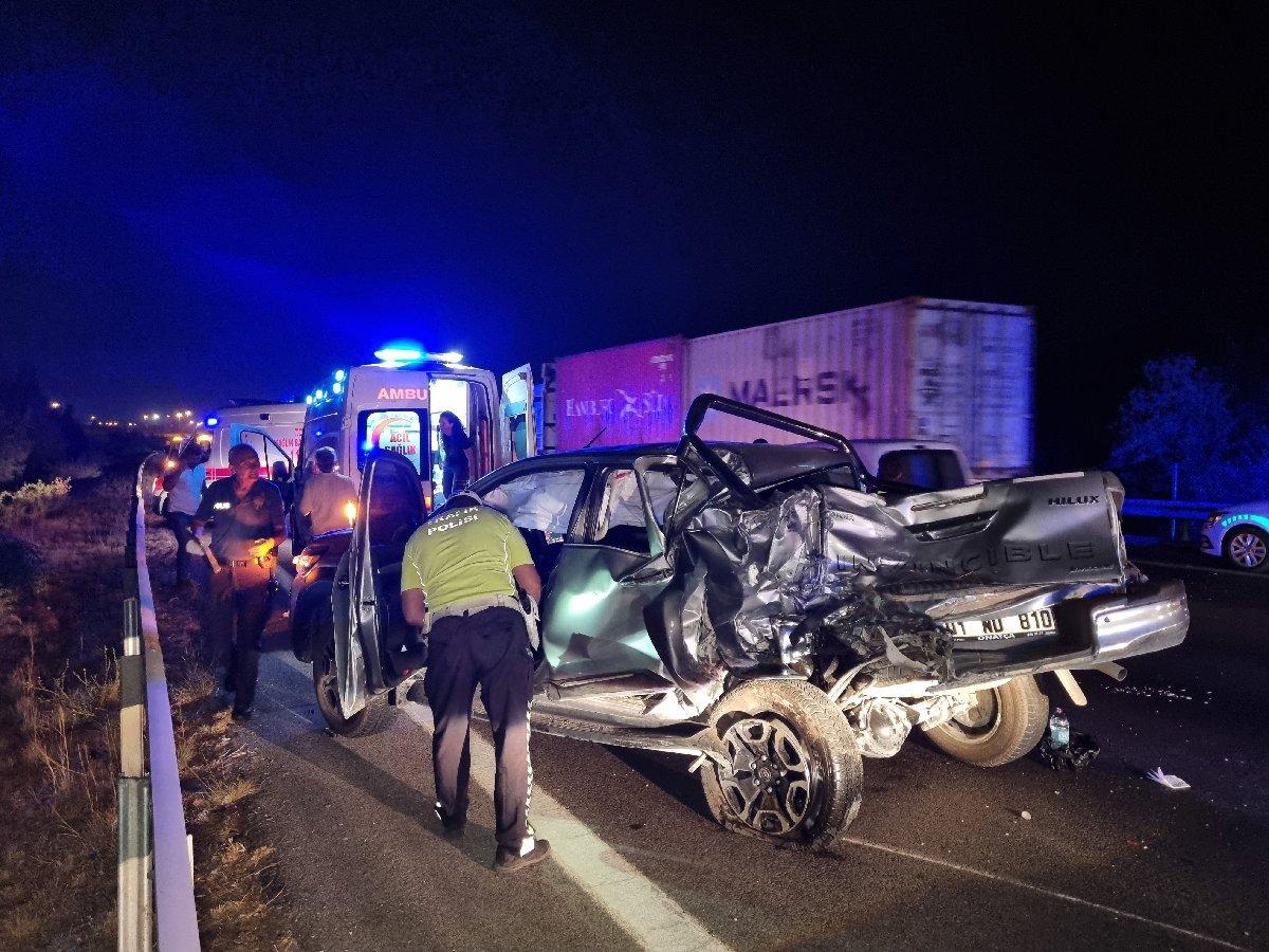 Çarpmanın etkisiyle pikap, sol şeride doğru sürüklendi. TIR sürücüsünün ihbarı üzerine kaza yerine polis ve sağlık ekipleri sevk edildi.
