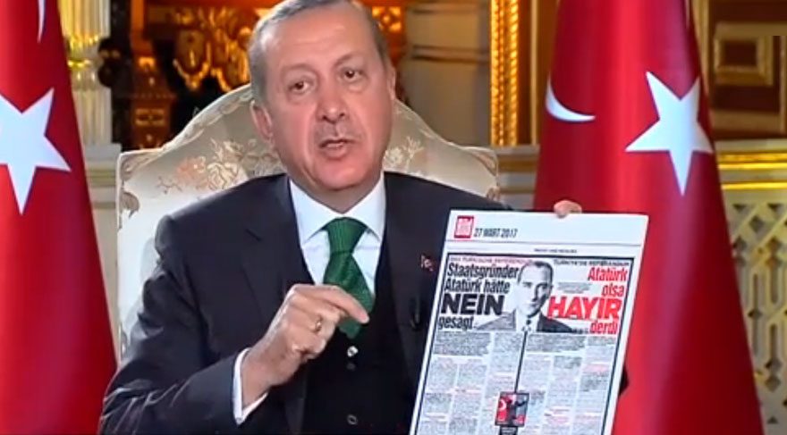 Almanya'da yayın yapan Bild gazetesinin manşetinin ardından başlayan "Atatürk yaşasaydı referandumda Hayır'dan yana mı Evet'ten yana mı tavır alırdı" tartışması devam ediyor. Tartışmalara ilişkin Atatürkçü Düşünce Derneği Genel Merkezi de yazılı bir açıklama yaptı. Açıklamada, "Hem Cumhurbaşkanı Erdoğan hem de AKP, başlarının her sıkışmasında Atatürk'e sığınmayı alışkanlık haline getirmiş bulunuyor. Referandumda 'Hayır' rüzgarını tersine çevirebilmek uğruna Atatürk'ün tek kişi yönetimine 'Evet' diyeceği öne sürülüyor. Atatürk başı sıkışanların, zorda kaldıklarında sığınacakları bir liman değil, görüşlerini okuyup, anlayıp onun yolunda ilerleyenlerin yanındadır" denildi.