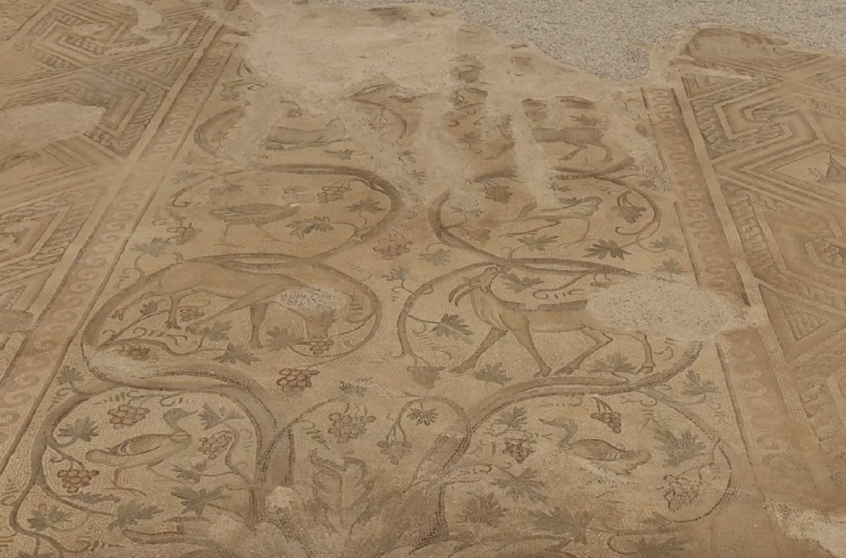 2009'daki kazılarda bulunan ve 1500 yıl öncesine tarihlendirilen 155 metrekarelik mozaikte, yaban keçileri ve çeşitli hayvanların otlaması, kalp ve baklava motifleri görülüyor.