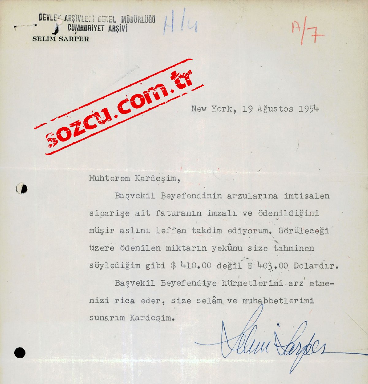 Hariciye'de 27 yılı geride bırakan tecrübeli diplomat, kağıda 19 Ağustos 1954 tarihini ve şık imzasını attı. Bir de fatura ekleyerek, Ankara'ya gönderdi.