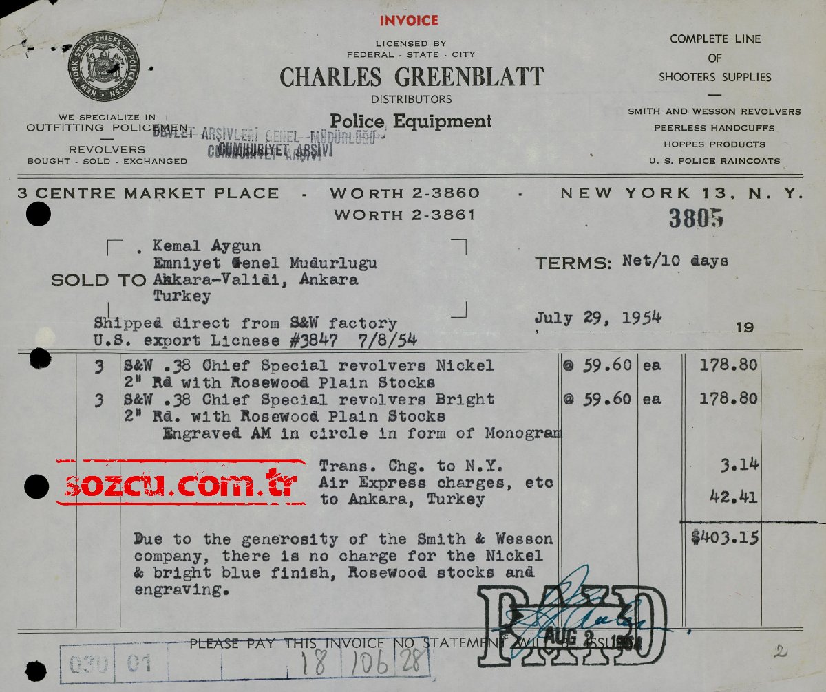 403 dolar 15 sentlik fatura Emniyet Genel Müdürlüğü koltuğunu 5 Haziran 1954 günü Ethem Yetkiner'e bırakan Kemal Aygün adına kesilmişti. Adres olarak da "Emniyet Genel Müdürlüğü, Ankara, Türkiye" gösterilmişti.