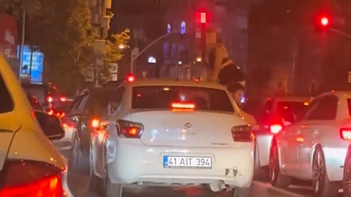 Bağdat Caddesi'nde gece saatlerinde trafikte seyreden bir aracın ön koltuğunda oturan kadın kırmızı ışığın yanmasının ardından aracın camına çıkarak twerk yapmaya başladı.
