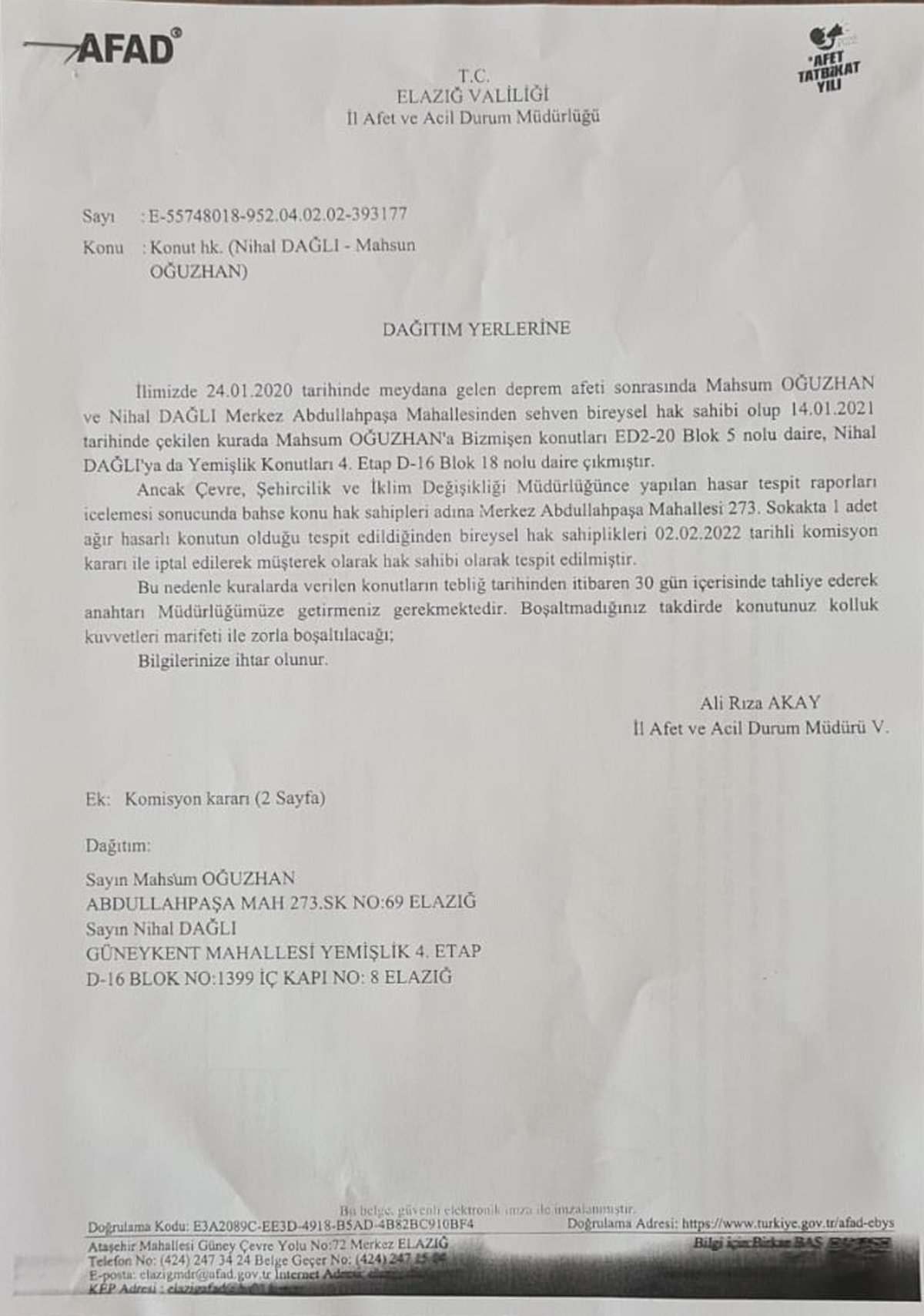 İl Afet ve Durum İl Müdürlüğü tarafından Oğuzhan ve Dağlı kardeşlere gönderilen tebligatta, “İlimizde 24.01.2020 tarihinde meydana gelen deprem afeti sonrasında Mahsun Oğuzhan ve Nihal Dağlı merkez Abdullahpaşa Mahallesinden sehven bireysel hak sahibi olup 14.01.2021 tarihinde çekilen kurada Mahsun Oğuzhan’a Bizmişen konutları ED2-20 Blok 5 nolu daire, Nihal Dağlı’ya da Yemişlik konutları 4. Etap D-16 Blok 18 nolu daire çıkmıştır. Ancak Çevre Şehircilik ve İklimlendirme Müdürlüğünce yapılan hasar tespit raporları incelemesi sonucunda bahse konu hak sahipleri adına Merkez Abdullpaşa Mahallesi 273. Sokakta 1 adet ağır hasarlı konutun olduğu tespit edildiğinden bireysel hak sahiplikleri 02.02.2022 tarihli komisyon kararı ile iptal edilerek müşterek olarak hak sahibi olarak tespit edilmiştir. Bu nedenle kuralarda verilen konutların tebliğ tarihinden itibaren 30 gün içerisinde tahliye edilerek anahtarı müdürlüğümüze getirmeniz gerekmektedir. Boşaltmadığınız takdirde kolluk kuvvetleri marifeti ile zorla boşaltılacağı bilgilerinize ihtar olunur” denildi.