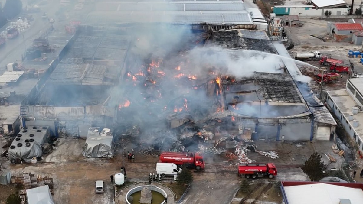 Afyonkarahisar Organize Sanayi Bölgesi’ndeki orman ürünleri imalatı yapan işletmenin deposunda çıkan yangına ekiplerin müdahalesi devam ediyor.