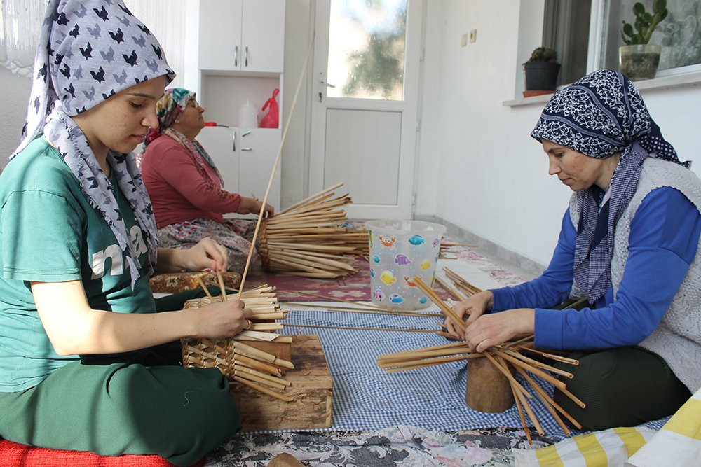 Kursta hasırcılığı öğrenen kadınlardan beşi bir araya gelip kiraladıkları atölyede çanta, şapka, avize, damacana kılıfı, şişelik gibi ürünler üretiyor.