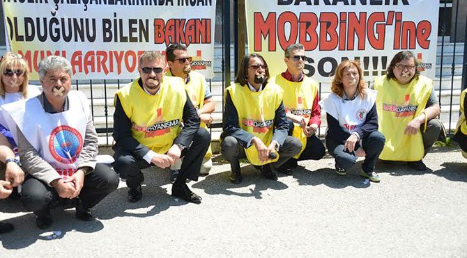 Sağlık Çalışanları Sendikası Aydın İl Başkanı Dr. Aydın Bilgin'in meslekten ihraç etme girişimine tepki gösteren sağlık çalışanları, Sağlık Bakanlığı önünde ağızlarına bant yapıştırarak oturma eylemi yaptı.
