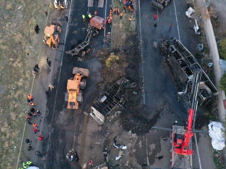 Karşı şeride geçen otobüs, yan yatan kamyonun kaldırılmasında çalışan kepçeye, ardından da kamyona çarptı. Kazayla birlikte otobüs, TIR ve kamyon alev aldı.