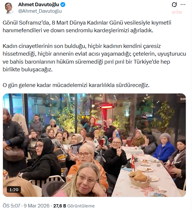 Davutoğlu paylaşımında, “Gönül Soframız’da, 8 Mart Dünya Kadınlar Günü vesilesiyle kıymetli hanımefendileri ve down sendromlu kardeşlerimizi ağırladık” ifadelerini kullandı.
