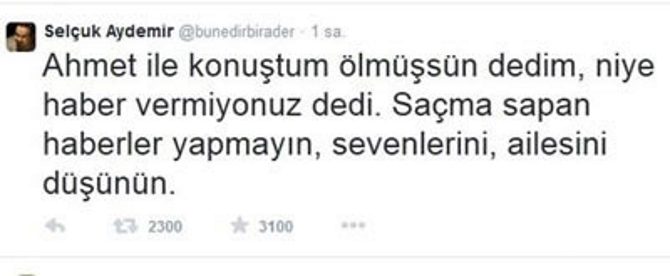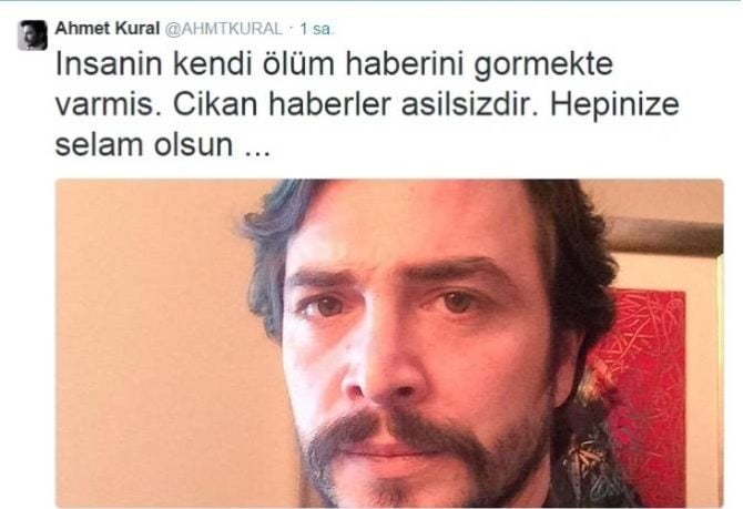 Ünlü oyuncu Ahmet Kural, resmi Twitter hesabından bir açıklama yaparak sosyal medyada kendisi hakkında çıkan ölüm haberlerinin asılsız olduğunu belirtti. Kural yaptığı açıklamada, ''İnsanin kendi ölüm haberini görmekte varmış. Çıkan haberler asılsızdır. Hepinize selam olsun ...'' ifadelerini kullandı.